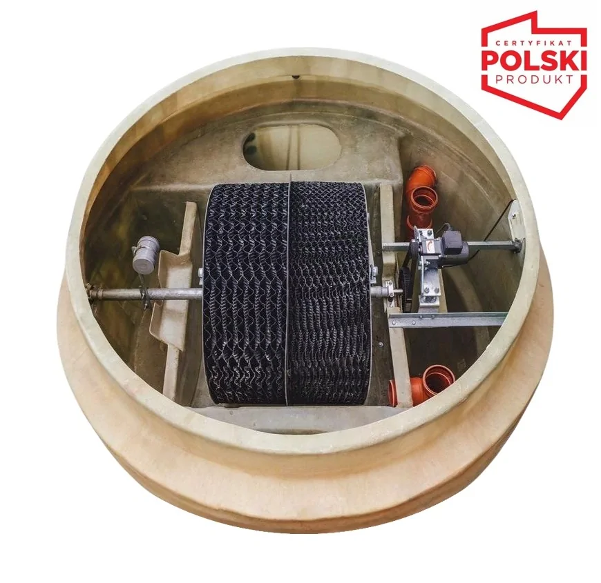 Oczyszczalnia wykorzystuje technologię złóż obrotowych (RBC), zapewniając wysoką skuteczność oczyszczania, cichą i energooszczędną pracę oraz całkowity brak nieprzyjemnych zapachów.
