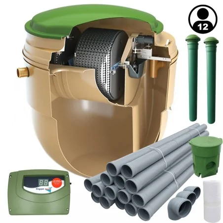 Oczyszczalnia biologiczna Kingspan BioDisc BB + drenaż 36 mb to zaawansowany system oczyszczania ścieków przeznaczony dla obiektów zamieszkałych przez maksymalnie 12 osób (12 RLM). Urządzenie wykorzystuje opatentowaną technologię złóż obrotowych z kubkami przelewowymi, która zapewnia wyjątkową elastyczność pracy i skuteczność oczyszczania na poziomie do 98%.