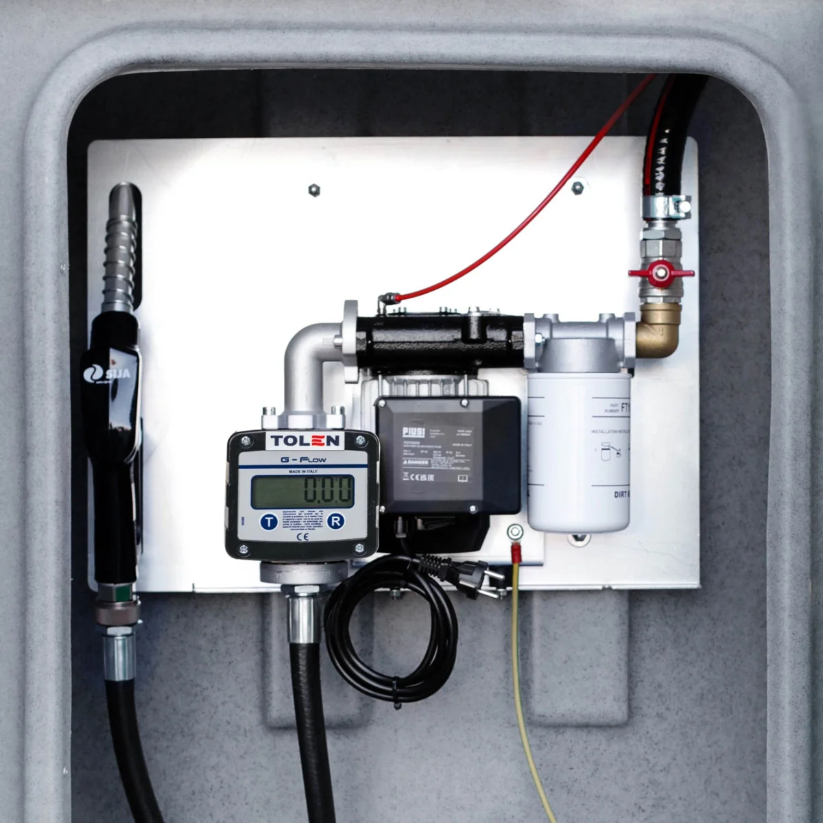 Zbiornik JFC 1300L SPECIAL z włoską pompą PIUSI 79 l/min, licznik Adam Pumps G-Flow filtrem i zdalnym wskaźnikiem poziomu paliwa. Solidna konstrukcja, szafa zamykana na klucz, komplet dokumentów UDT. 10 lat gwarancji na zbiornik.
