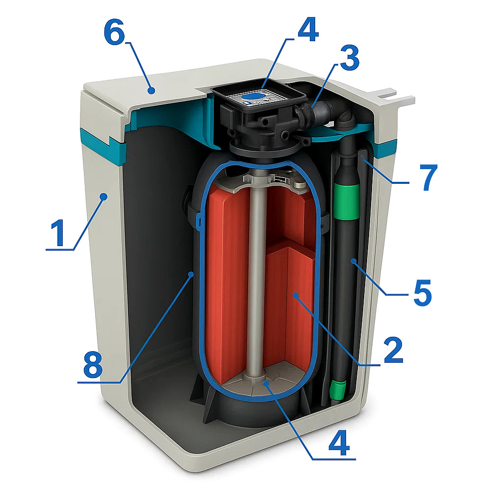 Urządzenie jest często wybierane jako centralna stacja uzdatniania wody do domów 4-6 osobowych, w których występuje problem kamienia, rdzawych zacieków lub metalicznego posmaku wody. Automatyczna regeneracja objętościowa sprawia, że system zużywa tylko tyle soli i wody, ile jest faktycznie potrzebne, co przekłada się na niskie koszty eksploatacji.