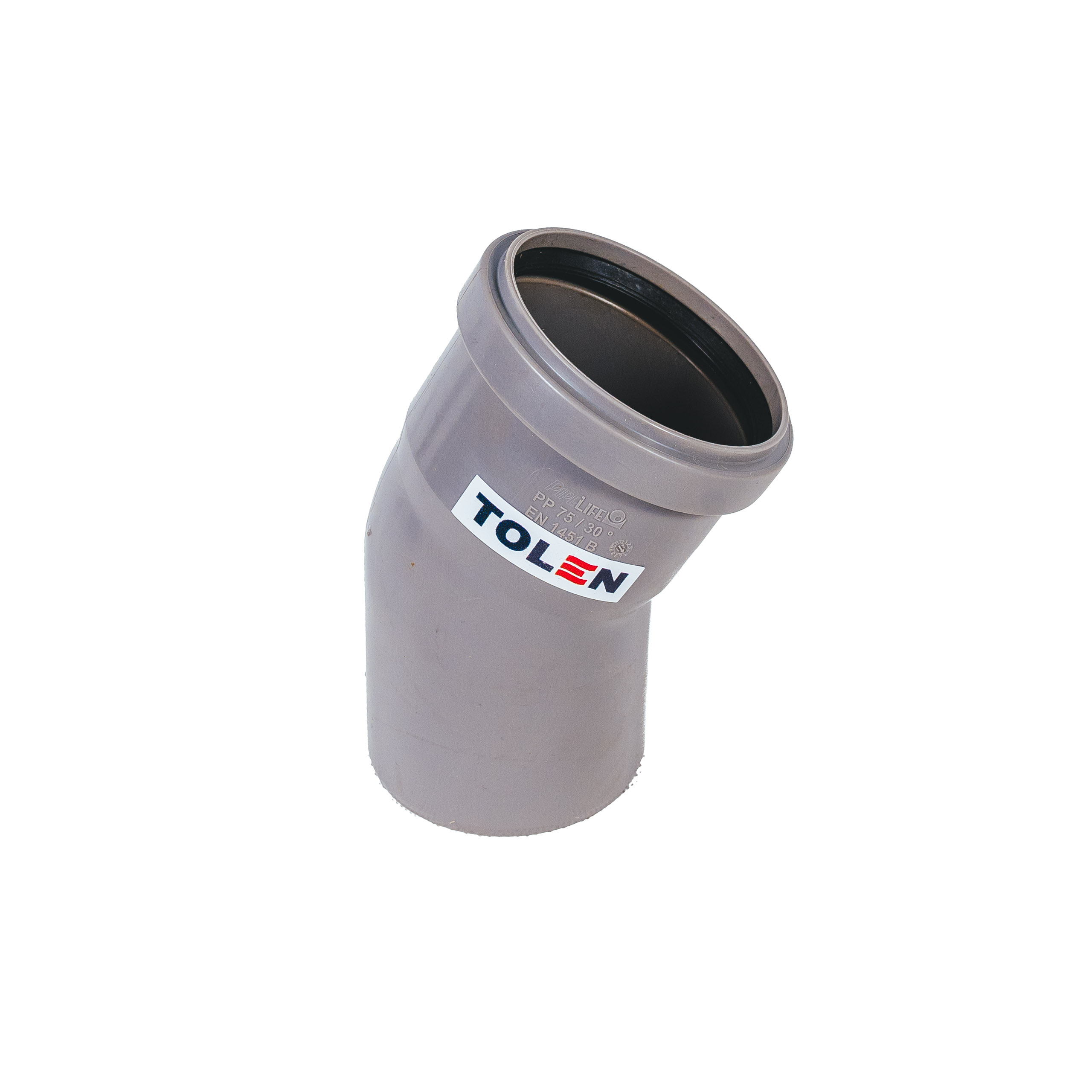 Kolano kanalizacyjne TOLEN 75 mm o kącie 30° przeznaczone do zmiany kierunku przewodów w wewnętrznych instalacjach kanalizacyjnych. Wykonane z polipropylenu PP, z połączeniem kielichowym i uszczelką, gwarantuje szczelność, odporność chemiczną oraz łatwy montaż.