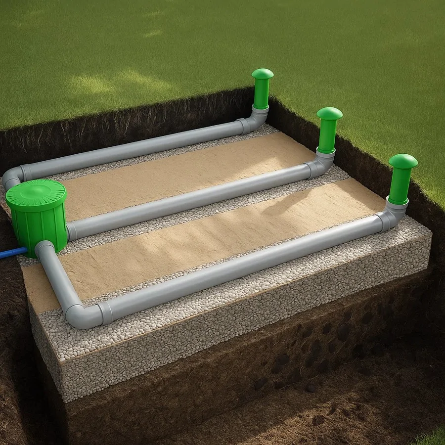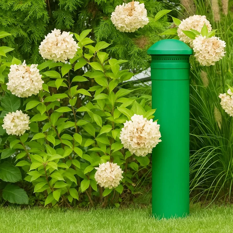 ![]() | ✅ Zadbaliśmy o estetykęKażda nitka powinna być zakończona wywiewką z rury i grzybka wentylacyjnego by zapewnić odpowiednią wentylację drenażu i oczyszczalni. Wywiewki te wystają ok. pół metra nad grunt i są narażone na działanie promieni UV. W związku z tym zastosowaliśmy rurę i grzybek w kolorze zielonym by ładnie komponował się w ogrodzie i był odporny na promieniowanie UV. |