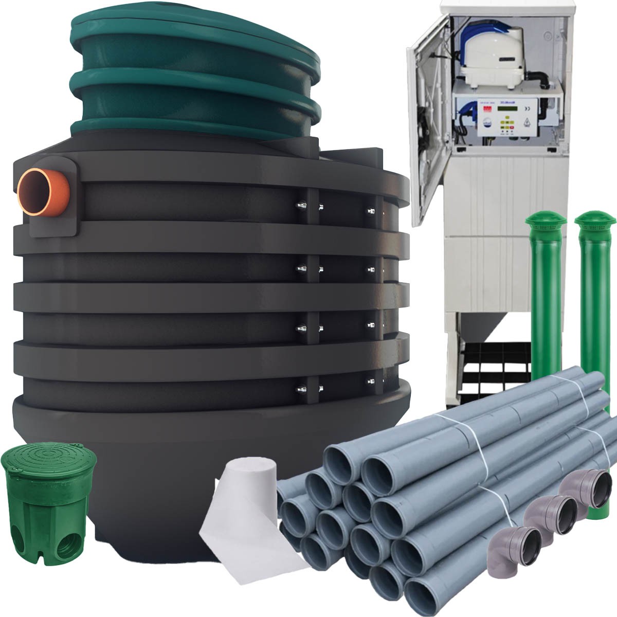 Delfin PRO PREMIUM 1,8 m3d to oczyszczalnia MBBR z dużym zbiornikiem 4500 L, dmuchawą SECOH EL S 60n i sterownikiem mikroprocesorowym. Zestaw zawiera kompletny drenaż rozsączający z rurami, studzienką rozdzielczą i geowłókniną, umożliwiający bezpieczne odprowadzenie ścieków.
