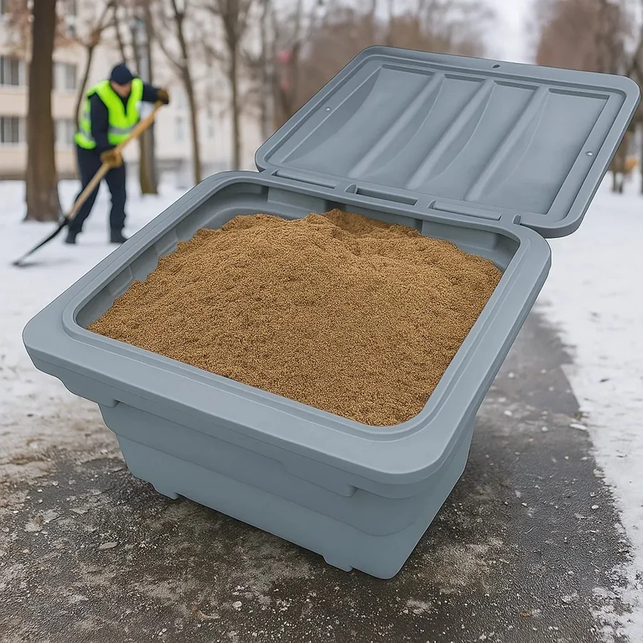 Pojemnik na piasek i sól JFC 350L – solidna i trwała skrzynia z polietylenu odporna na uszkodzenia oraz warunki atmosferyczne. Idealna do przechowywania soli drogowej, piasku i innych materiałów sypkich, zabezpiecza przed wilgocią i oblodzeniem.