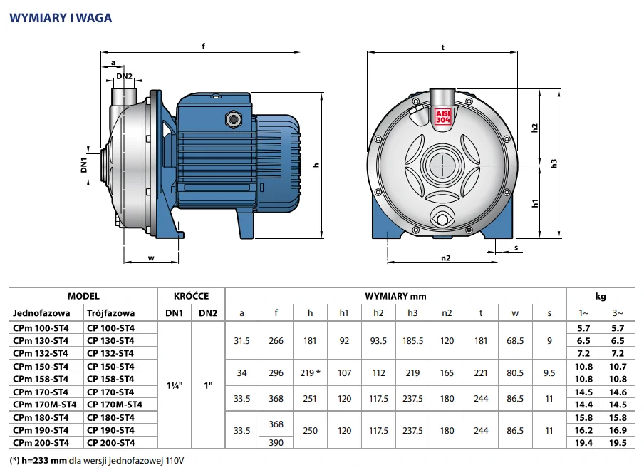 Jednostopniowa pompa odśrodkowa o mocy 0,37 kW, wykonana ze stali nierdzewnej AISI 304. Przeznaczona do tłoczenia czystej wody w instalacjach domowych, przemysłowych i rolniczych.