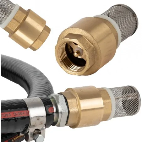 Solidny zawór zwrotny 1" z metalowym korpusem i koszem ssącym chroniącym przed zanieczyszczeniami. Zapewnia przepływ paliwa tylko w jednym kierunku, zabezpiecza pompę i instalację przed cofnięciem się cieczy oraz gwarantuje niezawodną pracę układu paliwowego.