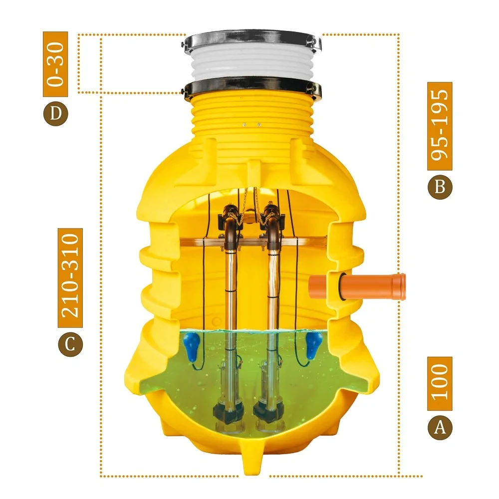 ![]() | 📝 Jak prawidłowo dobrać wielkość przepompowni? Dobór wielkości przepompowni ścieków wymaga uwzględnienia kilku kluczowych parametrów, aby zapewnić prawidłową pracę pompy i miejsce na osprzęt. Wlot nieczystości (wymiar A) powinien znajdować się minimum 100 cm nad dnem zbiornika, co gwarantuje poprawną pracę pompy. Wysokość przepompowni (wymiar B) musi odpowiadać głębokości ułożenia rur. Minimalna wysokość to 210 cm, a maksymalna 310 cm (wymiar C). Regulowany kołnierz pozwala dopasować wysokość przepompowni do terenu i wyrównać ją z otoczeniem. |