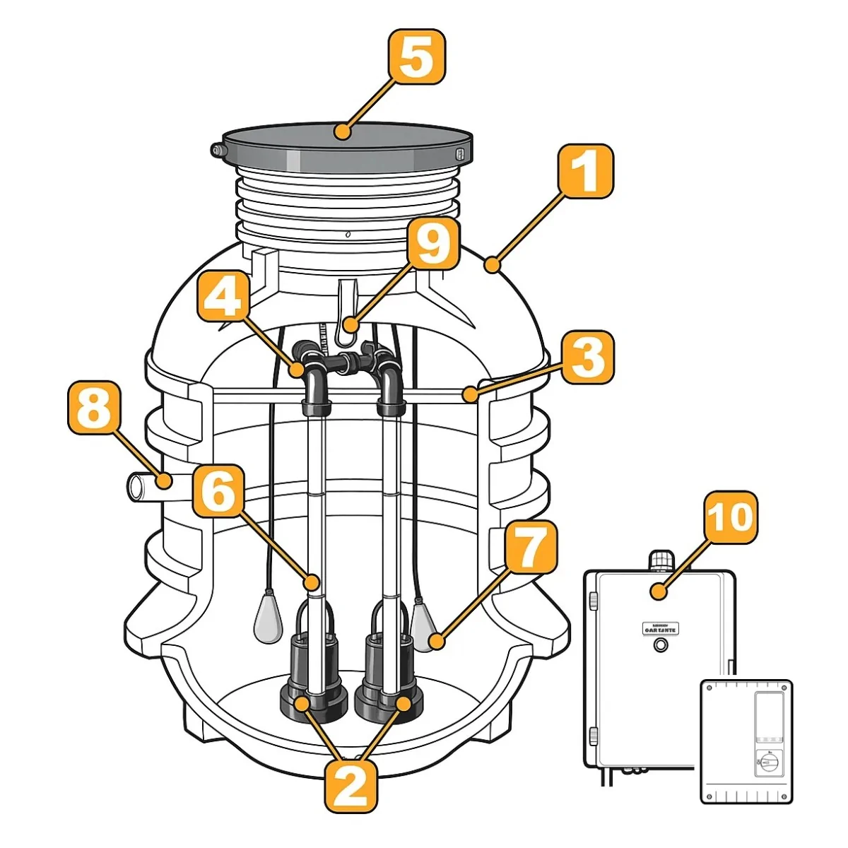 Kiedy i dlaczego potrzebna jest przepompownia ścieków? Przepompownia ścieków to urządzenie, które umożliwia bezpieczne i efektywne przemieszczanie ścieków z niższych miejsc do instalacji kanalizacyjnej lub oczyszczalni. Dzięki niej możliwe jest pokonanie różnic wysokości lub odległości, co jest niezbędne np. na terenach, gdzie naturalny spływ grawitacyjny ścieków jest utrudniony lub niemożliwy. Nasza przepompownia to kompletne, gotowe do pracy rozwiązanie, które zapewnia niezawodność, prostotę montażu oraz nowoczesne zabezpieczenia. Dlaczego przepompownia to doskonały wybór?