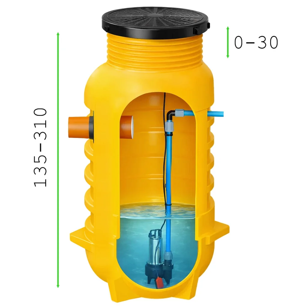 Najniższa wysokość przepompowni to 135 cm, a maksymalna 310 cm. Dzięki regulowanemu kołnierzowi można łatwo dopasować ją do poziomu terenu i otoczenia. |