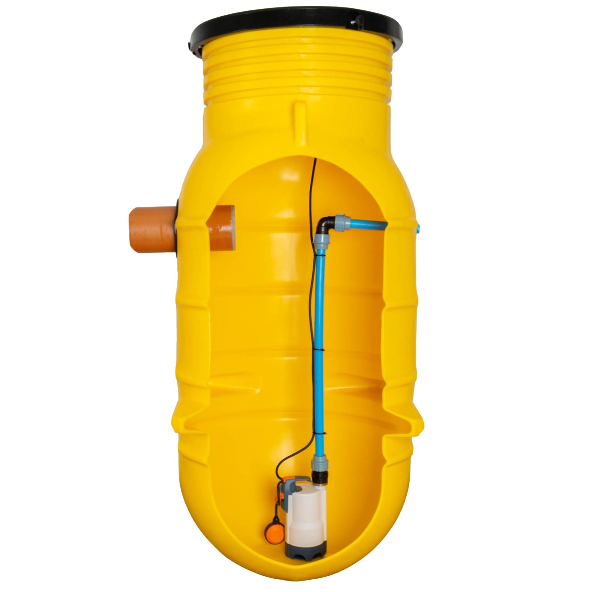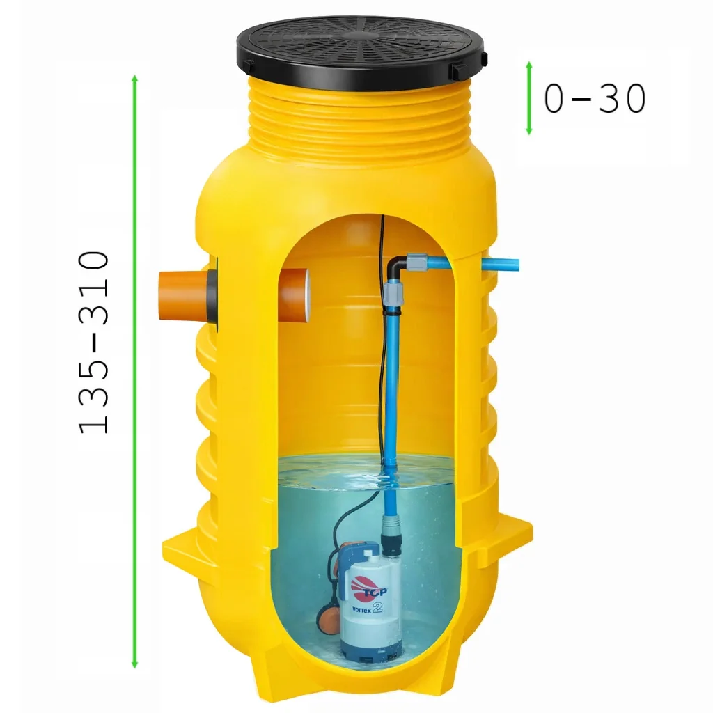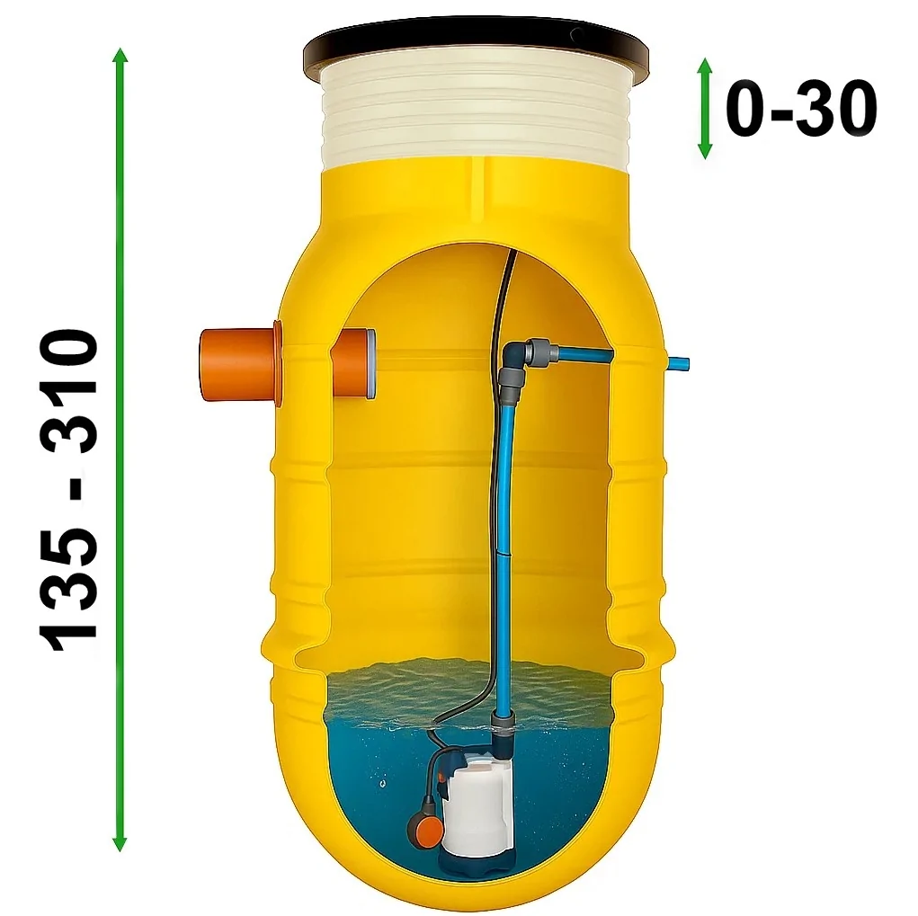 Najniższa wysokość przepompowni to 135 cm, a maksymalna 310 cm. Dzięki regulowanemu kołnierzowi można łatwo dopasować ją do poziomu terenu i otoczenia. |
