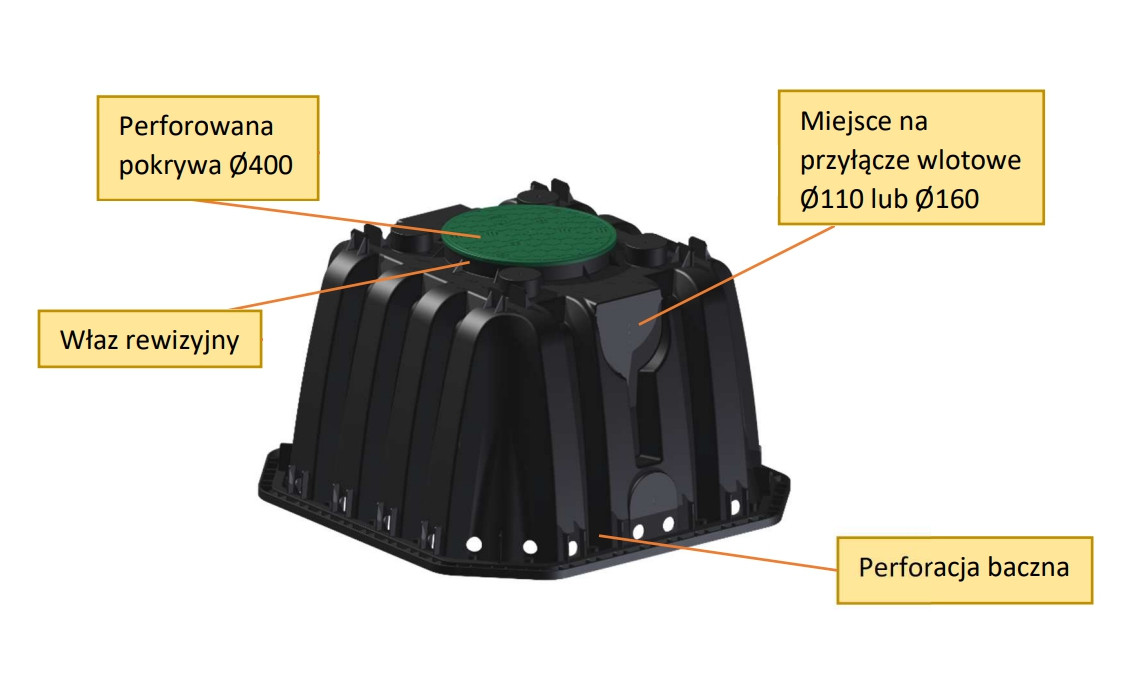 ![]() | 🏠 Przemyślana konstrukcja rozsączającaStudnia montowana jest bezpośrednio w gruncie, tworząc naturalne złoże rozsączające. Otwory perforacyjne umieszczone w dolnej części ścian bocznych umożliwiają efektywne przenikanie wody do warstw przepuszczalnych. Wysokość strefy perforacji wynosi około 100 mm, co zapewnia optymalną powierzchnię infiltracji nawet przy okresowo zwiększonym dopływie. |