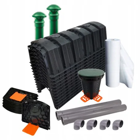 Zestaw 12 tuneli rozsączających Aquabin 150L z pokrywami, rurami, studzienką i geowłókniną. Przeznaczone do rozsączania ścieków i wód opadowych. Wykonane z PEHD, odporne na nacisk 3,5 t/m², zapewniają niezawodność i prosty montaż systemu.