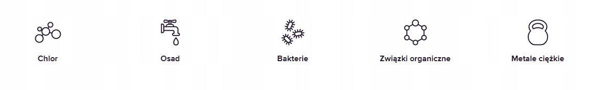 Wielofunkcyjna ochrona Usuwa z wody wodociągowej wszelkie zanieczyszczenia w tym chlor, związki organiczne, metale ciężkie, azotany i azotyny, twardość, bakterie i wirusy. |