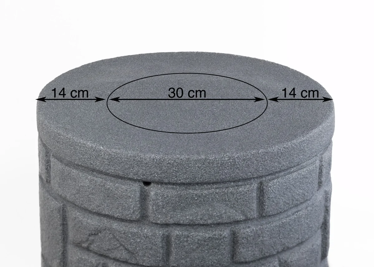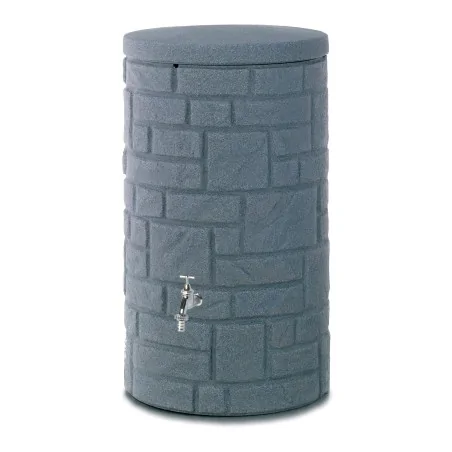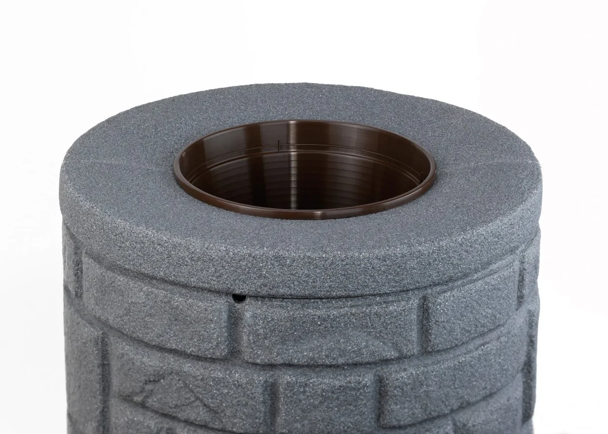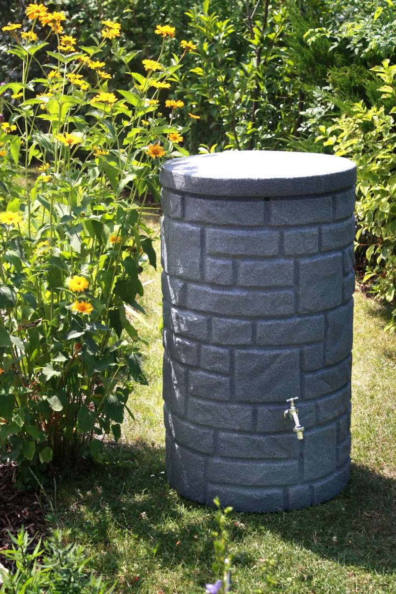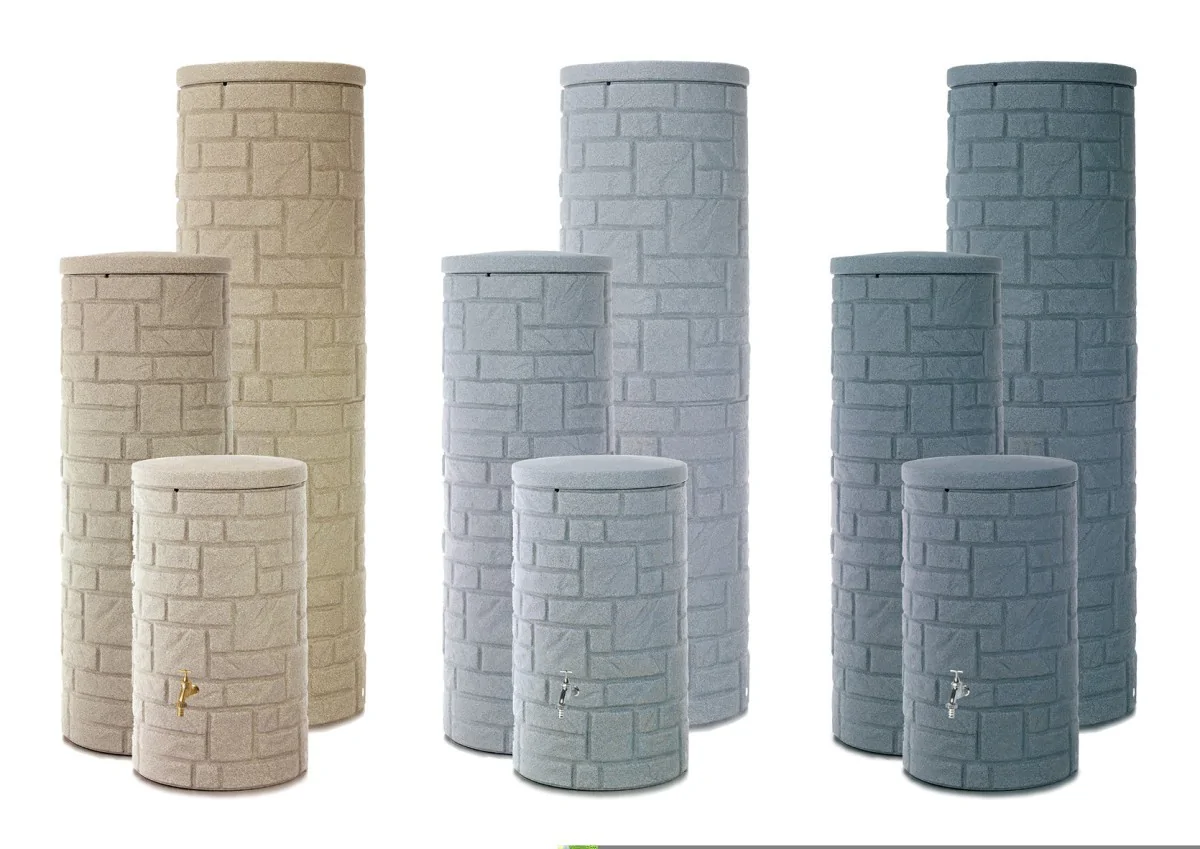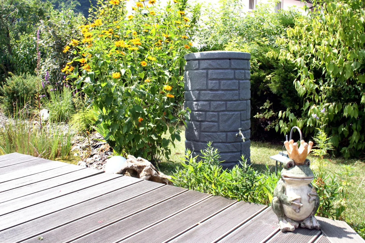 Kolumnowy zbiornik na deszczówkę Arcado, który doskonale imituje naturalny kamień lub małą, murowaną studnię. Stworzony z dbałością o szczegóły, nie tylko spełnia swoje praktyczne zastosowanie, ale również dodaje uroku przestrzeni na zewnątrz.