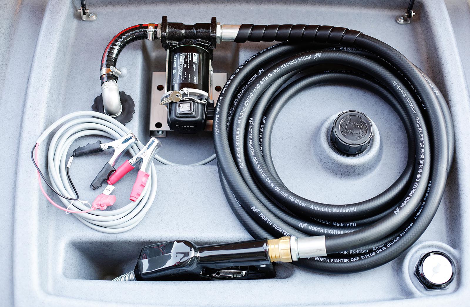 Swimer 400L z pompą PIUSI BP3000 12V to solidny mobilny zestaw do dystrybucji oleju napędowego. Wyposażony w pistolet automatyczny, wąż Continental, wskaźnik paliwa i siłowniki klapy. Lekki, bezpieczny i zgodny z normami ADR do transportu paliwa.