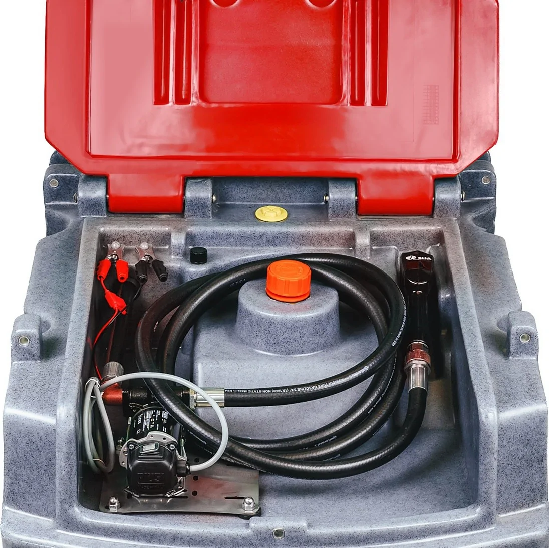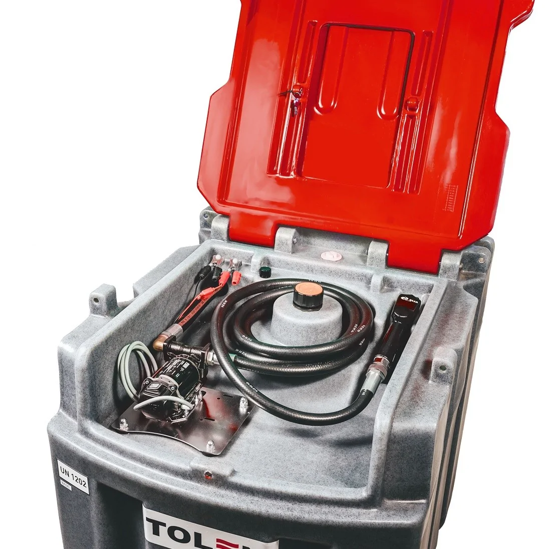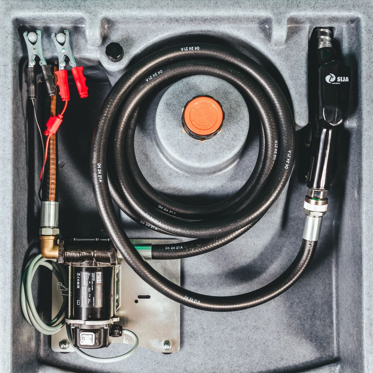 Mobilny zbiornik JFC 425L BASIC do oleju napędowego wyposażony w pompę Piusi BP3000 12V, pistolet automatyczny A039 i wąż Continental. Ekonomiczne, trwałe i wygodne rozwiązanie do transportu i tankowania paliwa, zgodne z normami ADR.