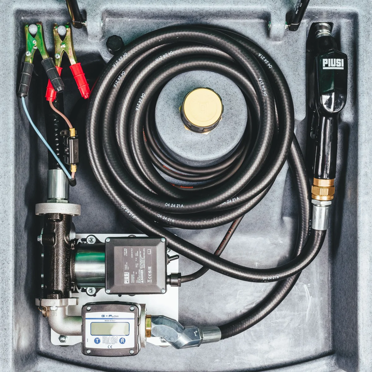 | Zbiornik mobilny JFC 425 L w wersji PROFESIONAL w solidnie skonfigurowanym i złożonym zestawie zapewniający szybkie tankowanie i dokładny pomiar wydanego paliwa gwarantującym długotrwałą i bezawaryjną pracę. ✅ Układ dystrybucyjny Profesional został złożony z podzespołów gwarantujących najwyższa jakość i najwyższe parametry użytkowania. W tym celu zastosowaliśmy.1. Pompę Piusi Panther DC 12V która daje realną wydajność 56 L / min. 2. Włoski licznik G Flow z pamięcią 5 ostatnich tankowań (możesz kontrolować wydawane paliwo). Z wysoką dokładnością tankowanego paliwa. 3. Oryginalny pistolet Piusi A60 z mosiężna obrotnicą. 4. By uniknąć skręcania i załamywania się węża co wiąże się z utratą szczelności zastosowaliśmy kolano obrotowe 5. Cały układ dystrybucyjny jest złożony na flanszach co pozwala na szybki i łatwy montaż i demontaż poszczególnych elementów do serwisu. 6. Węże renomowanej firmy Continental - 6m. 7. Zbiornik posiada wskaźnik poziomu paliwa 8. Siłowniki pneumatyczne zapobiegające opadaniu klapy 9. Szekle transportowe 10. Przewody zasilające z zabezpieczeniem termicznym o długości 3m.