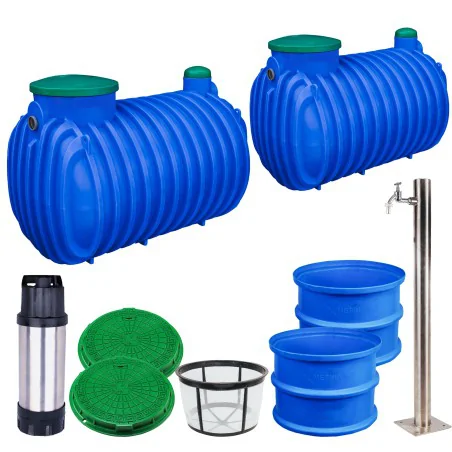 | Kompletny i profesjonalnie przygotowany system ogrodowy do magazynowania wody deszczowej Eko Plus Professional PLUS o pojemności 6000 L✅ Konfigurując zestaw Profesional Plus naszym celem było osiągnięcie jak największej funkcjonalności i wygody korzystania z deszczówki. W tym celu zastosowaliśmy:1. W pełni automatyczną pompę Comfort Automat. Pompa automatycznie się włącza i wyłącza w momencie odkręcenia kranu lub końcówki na wężu. To rozwiązanie daje komfort w korzystaniu i umożliwia podłączenie urządzeń typu zraszacze nawadniające bądź myjka ciśnieniowa. 2. Do poboru wody w tym zestawie służy nam kran z kwasówki do którego w bardzo wygodny sposób możemy podpiąć węża lub napełnić konewkę. 3. By zapewnić wysoką czystość wody i zabezpieczyć pompę przed nieczystościami spływającymi z wodą zastosowano kosz filtracyjny. 4. W standardzie mamy 2 włazy z konglomeratu o nośności 1,5 T po którym można chodzić i jeździć kosiarką. Ułatwia to wykaszanie trawy wokół zbiornika. 5. Zbiornik Eko Plus można montować w każdych warunkach gruntowo wodnych jest to możliwe dzięki wytrzymałej konstrukcji zbiornika (mocne użebrowanie). W zestawie znajduje się dwa zbiorniki. Powyższy zbiornik występuje w trzech pojemnościach 2000 L 3000 L 4000 L, by właściwie dobrać pojemność zbiornika należy wziąć pod uwagę wielkość dachu i ogrodu. W tym celu skorzystaj z naszego doświadczenia. Zapraszamy do kontaktu. 6. W zestawie otrzymujemy dwie nadbudowy do zbiornika co nie generuje nam dodatkowych kosztów.